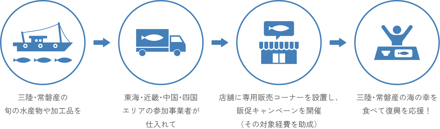 ③上記①②のいずれかの条件を満たす小売業等に水産物を納める卸売業・商社等。ただし、卸売業・商社等の場合は、応募の段階で復興水産物を販売する小売業等と実施店舗や実施内容について協議し、合意を得ていること。