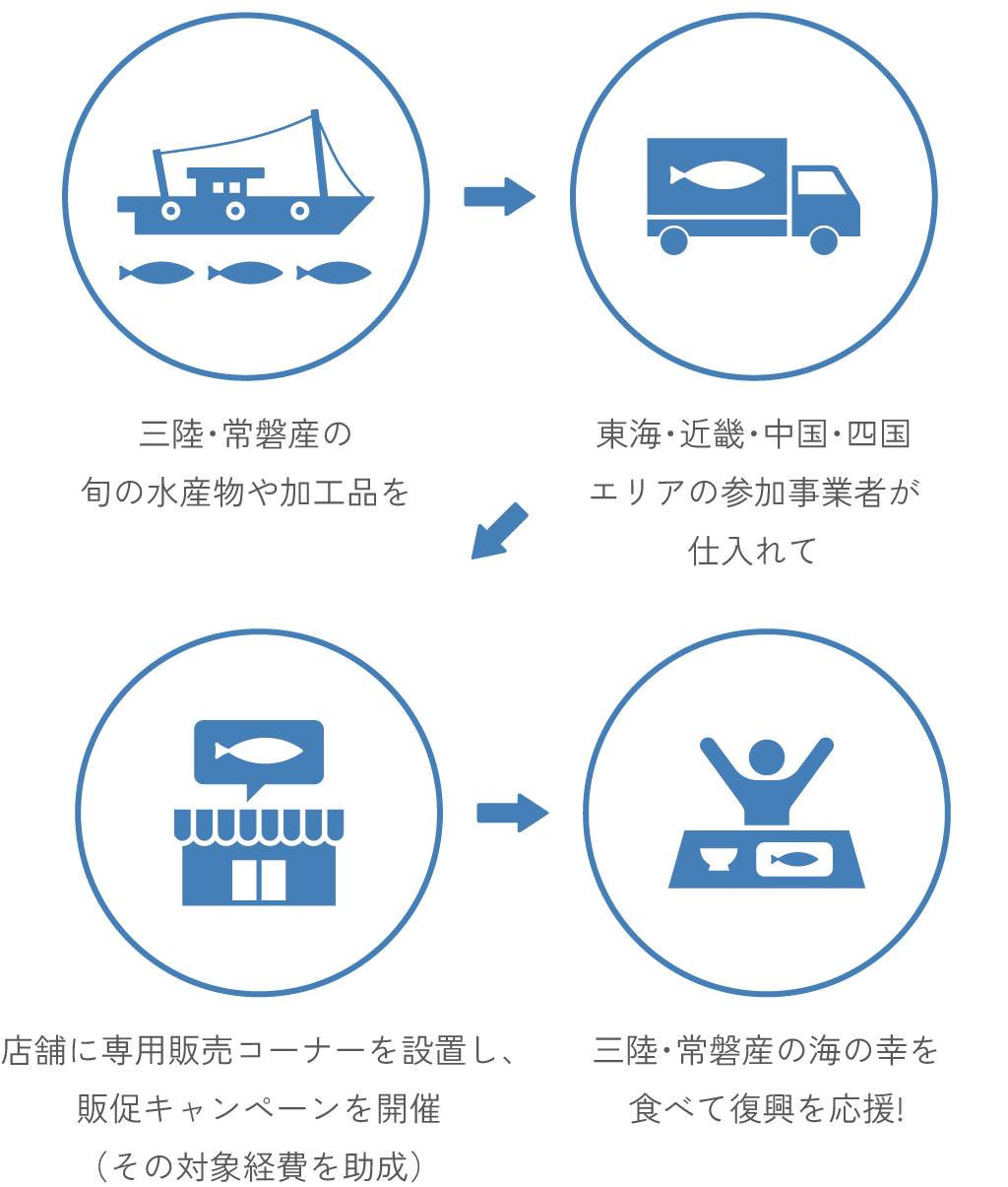 ●青森、岩手、宮城、福島、茨城、千葉で水揚げされた鮮魚・活魚等(甲殻類、貝類、海藻類を含む)の水産物、または6県で加工された水産加工品(高次まで可)。